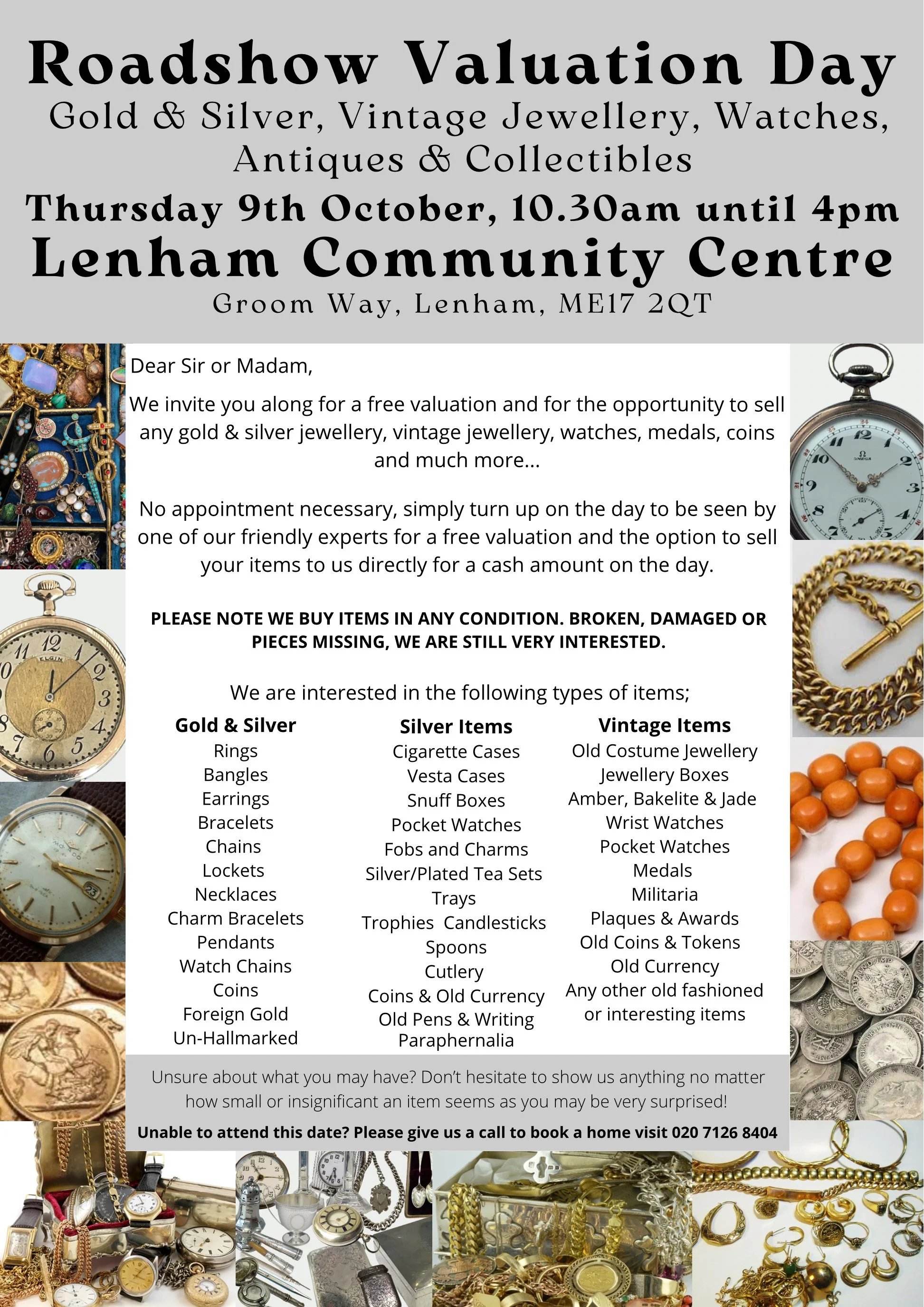 Visit us at one of our Roadshow Valuation Days local to you. We offer free valuations with the opportunity to sell any gold and silver jewellery, vintage jewellery, wrist watches, pocket watches, medals, coins and much more.